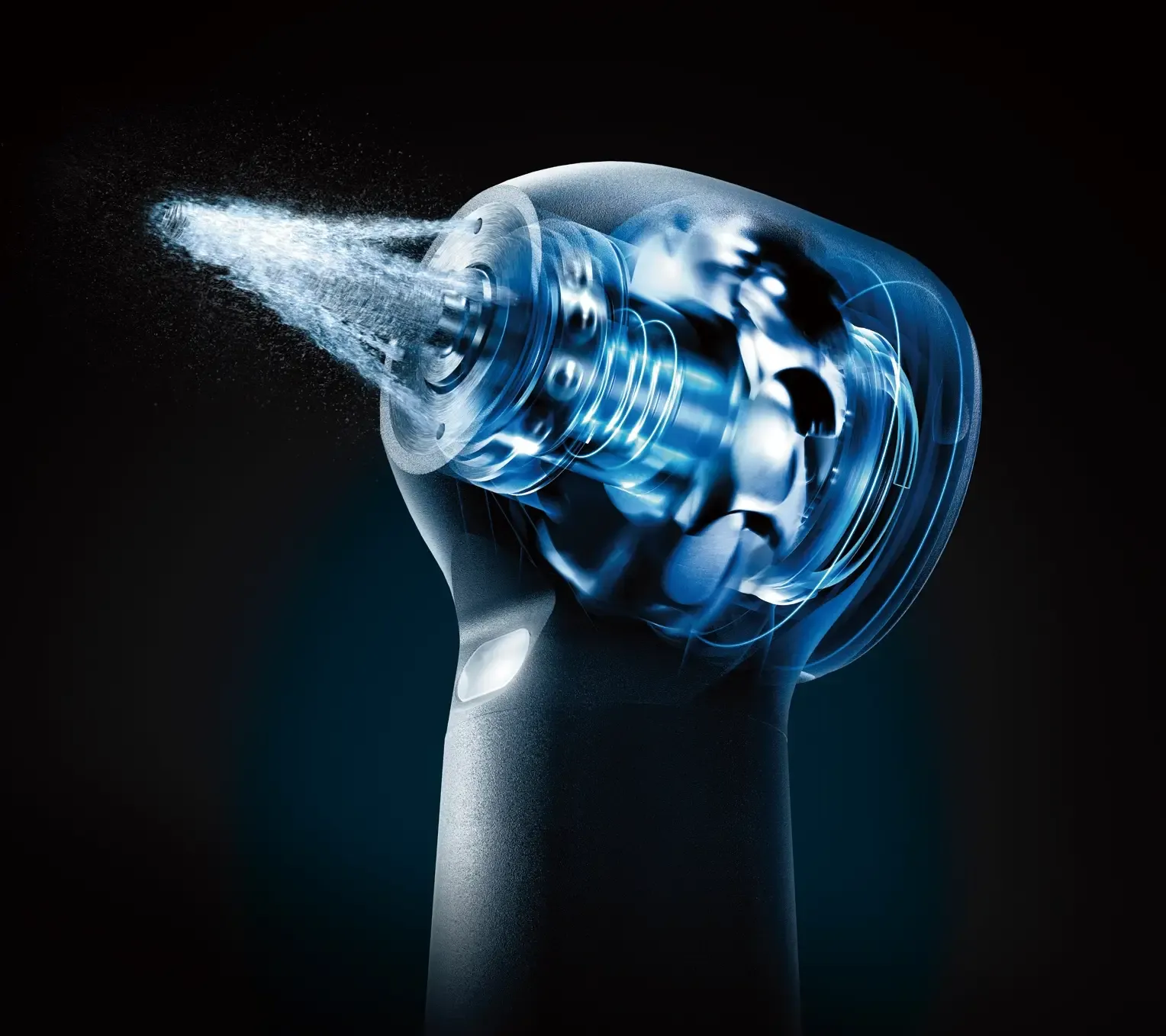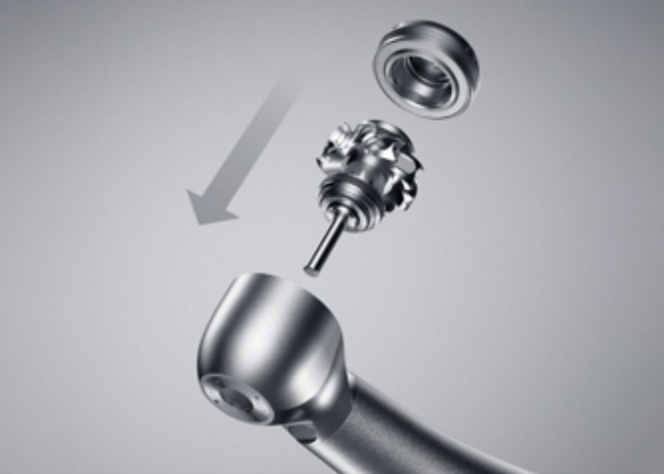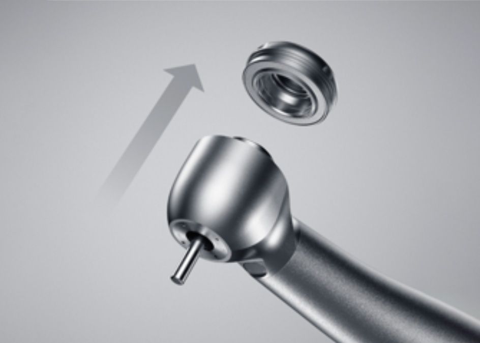 La función de parada rápida, que detiene la rotación de alta velocidad en aproximadamente un segundo, va situada sobre la parte delantera y trasera del cabezal. Las dos funciones de parada rápida permiten una parada rápida con el fin de evitar la rotación por inercia y reducir el riesgo tanto de atrapamiento intraoral como de succión, y así garantizar un tratamiento extremadamente seguro.