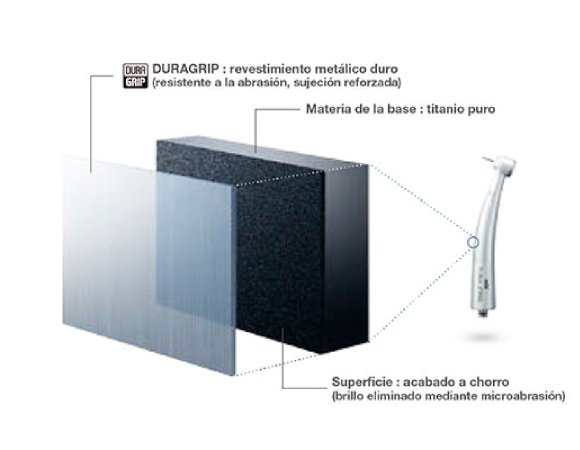 El acabado del cuerpo de titanio de las turbinas Z990L se realiza por micro abrasión antes de aplicar el revestimiento de superficie de DURAGRIP dando así al instrumento mayor resistencia a arañazos y una sujeción más firme y segura.