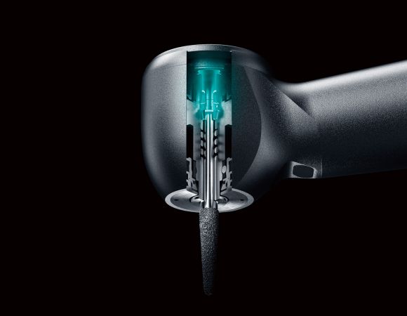 La turbina va equipada con el nuevo DURAPOWER CHUCK, que permite una mayor fuerza de agarre respecto del modelo convencional para reducir el riesgo de deslizamiento de la fresa. *El portafresas es la parte de la pieza manual que sujeta la fresa. El nuevo mecanismo del portafresas ha conseguido mejorar su durabilidad.